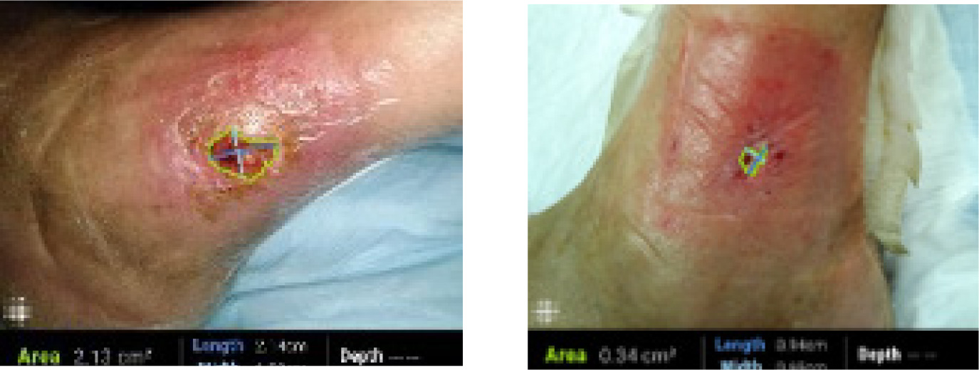 A 62-year-old Caucasian male with a medical history of chronic peripheral venous insufficiency presented with a venous leg ulcer on the lateral aspect of his left lower leg. The ulcer had developed spontaneously without preceding trauma, had been present for 6 weeks at the time of enrollment, and measured 2.13 cm2 (Figure 4, left picture). On examination, the wound was shallow with irregular borders, surrounded by hyperpigmented skin and mild periwound redness consistent with venous stasis changes. There were no signs of acute infection.