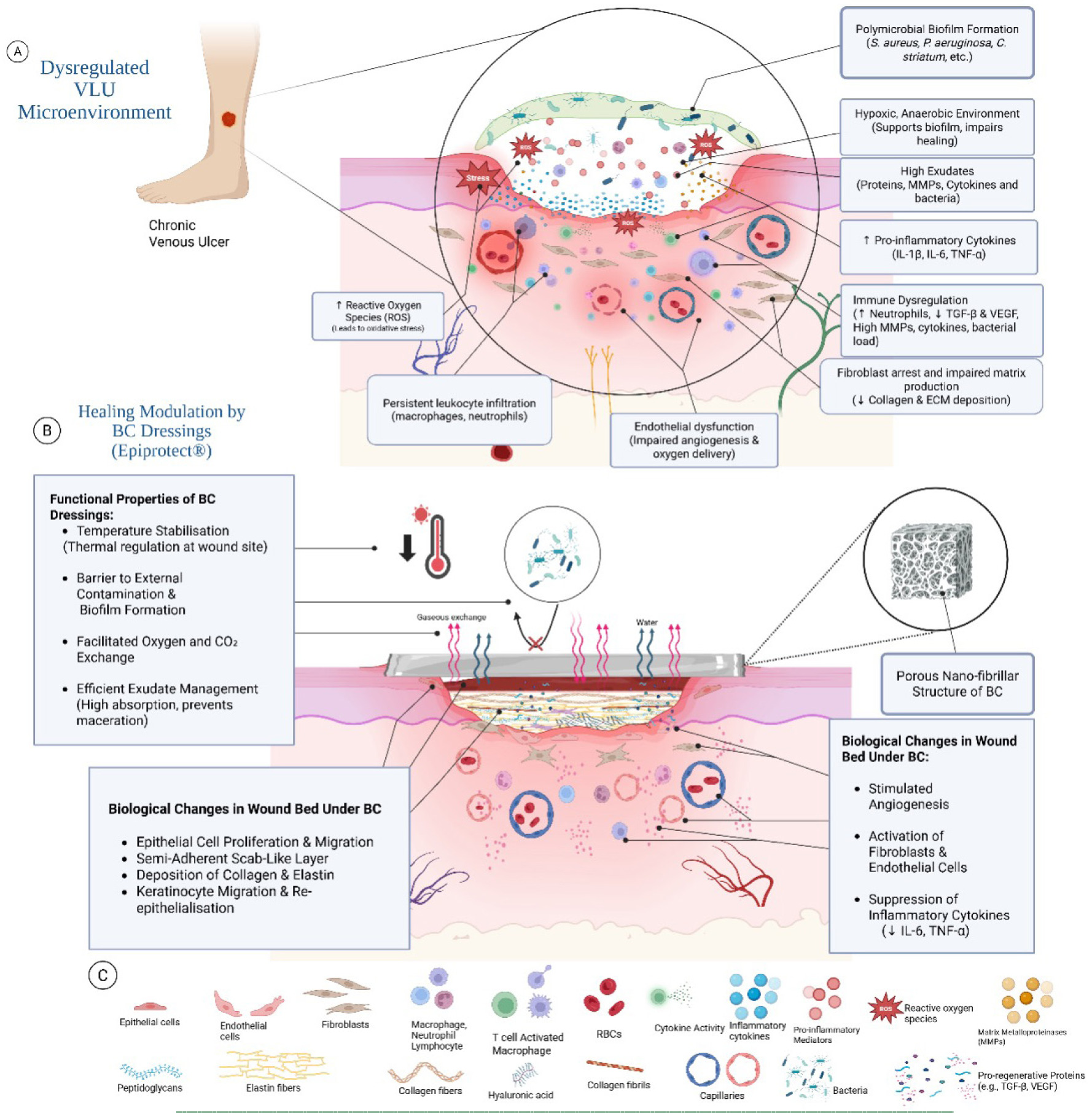 FIGURE 1 Illustration of the chronic wound microenvironment in venous leg ulcers (VLUS) and the proposed mechanisms by which biosynthetic cellulose (BC) dressings, such as Epiprotect, promote healing. The top panel highlights key features of VLU pathophysiology, including biofilm formation, endothelial dysfunction, and inflammatory dysregulation. The lower panel illustrates how BC supports wound healing by modulating inflammation, managing exudate, promoting tissue regeneration, and stabilising the microenvironment. Temperature stabilisation involves BC dressings maintaining a moist, thermally stable wound environment, potentially reducing heat loss and supporting cellular functions activity; Molecular and cellular components are indicated in the legend below.13,15-20 Illustration created in https://biorender.com