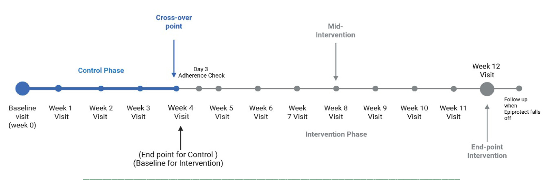• Pain: subjective pain rating reported by patient on a 0-10 scale. Recorded weekly visual analogue scale score (0 = no pain, 10 = worst pain).37 Pain scores were measured at enrollment, the end of the control phase, and weekly after applying Epiprotect.37