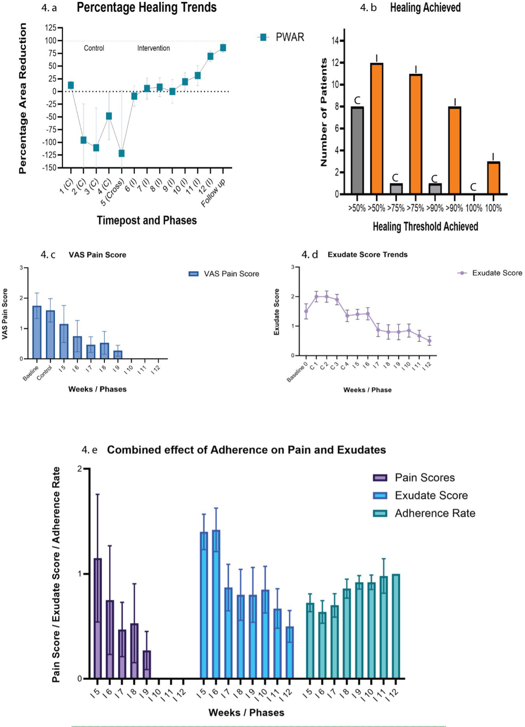 PWAR was selected for its widespread use in venous ulcer research as a relative healing metric but was interpreted alongside absolute wound area reduction and healing thresholds to mitigate the known volatility of small, heterogeneous wounds or those exhibiting early deterioration. Primary analyses were pre-specified as comparisons of PWAR and absolute wound area reduction across defined study phases (control, intervention, follow-up). Week-to-week comparisons, correlation analyses, and secondary outcomes (pain, exudate, adherence) were considered exploratory and hypothesis-generating. No formal correction for multiple testing was applied due to the small sample size and service-evaluation design, where such adjustment would substantially increase the risk of type II error.