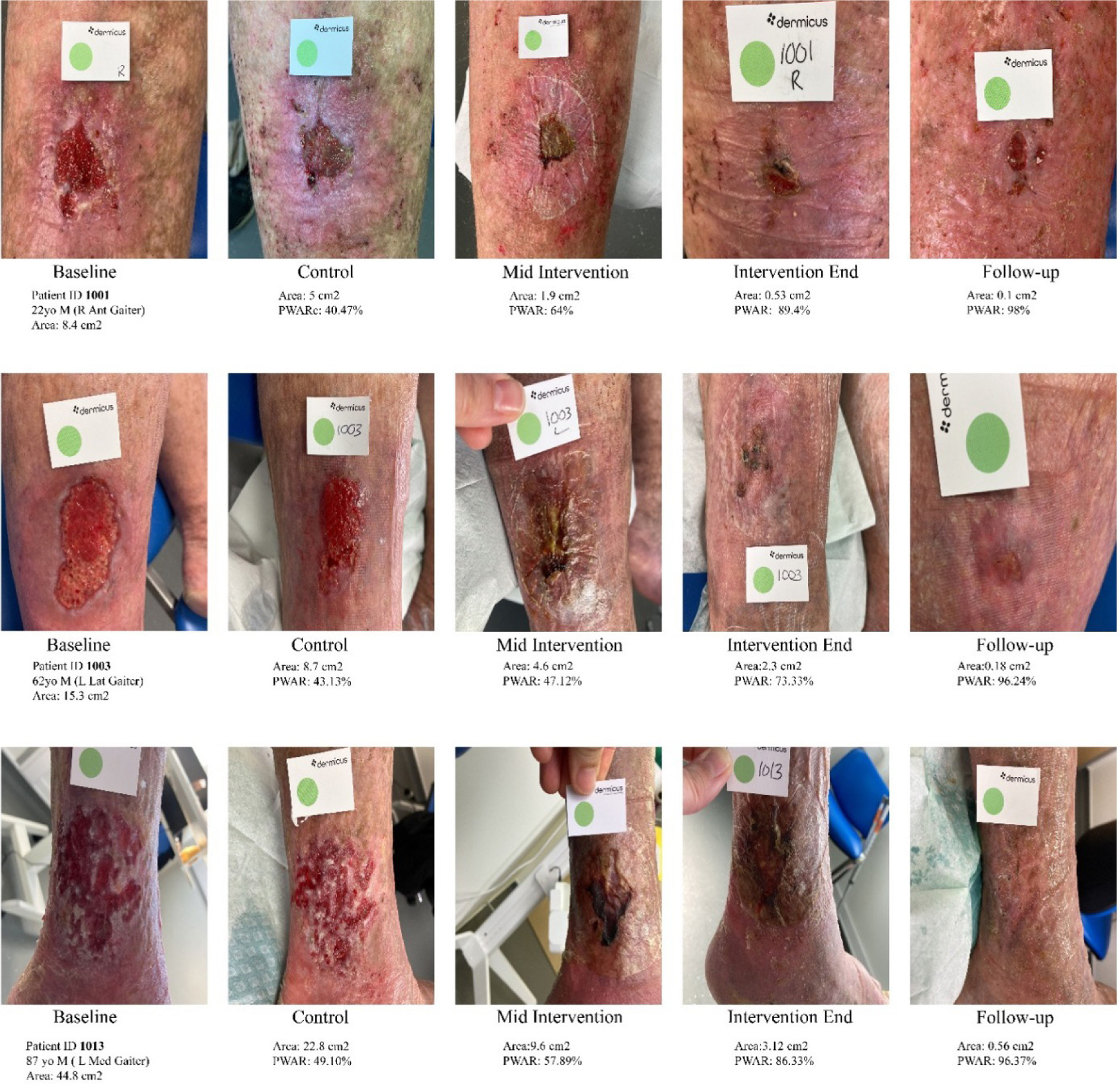 FIGURE 5 Representative wound healing trajectories during the control and Epiprotect intervention phase. Images were acquired under consistent lighting and distance using Dermicus® digital imaging. Sequential clinical photographs from three patients illustrate progressive wound contraction and epithelialisation across study phases (Baseline → Control → Mid-intervention → Intervention End → Follow-up). All wounds were chronic venous leg ulcers located on the gaiter region. Each row represents an individual case: Top row (Patient 1001, M, 72 y): PWAR improved from 40.47 % (control) to 98 % at follow-up, with near-complete closure by Week 12; Middle row (Patient 1003, M, 63 y): PWAR increased from 43.13 % to 96.24 %, showing rapid granulation and epithelial edge migration after Epiprotect application; Bottom row (Patient 1013, M, 87 y): PWAR rose from 49.10 % to 96.37 %, demonstrating sustained reduction in wound area and inflammation.