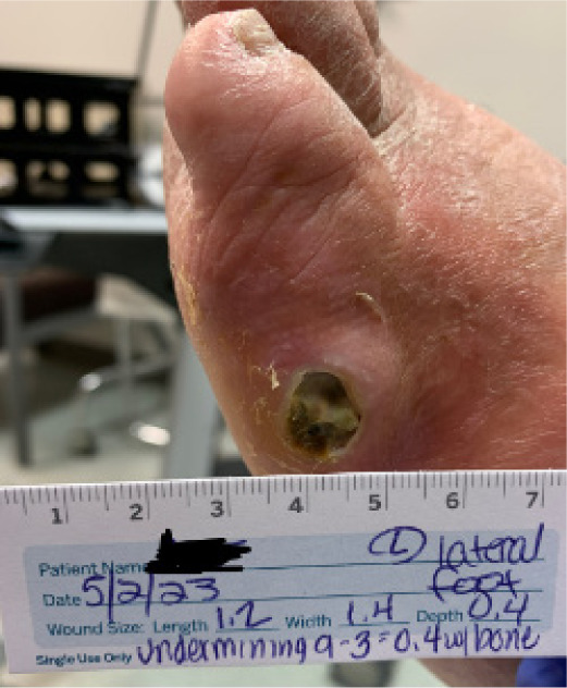 A 61-year-old male with a medical history of type 2 diabetes mellitus (A1c 7.4%), hypertension, hyperlipidemia, chronic obstructive pulmonary disease (COPD), arthritis, and prior pneumonia presented with a chronic ulcer over the lateral aspect of the left fifth metatarsal. Past surgical history included appendectomy, coronary artery bypass grafting, cardiac catheterization, bilateral cataract extraction, right hemicolectomy, and total knee arthroplasty.