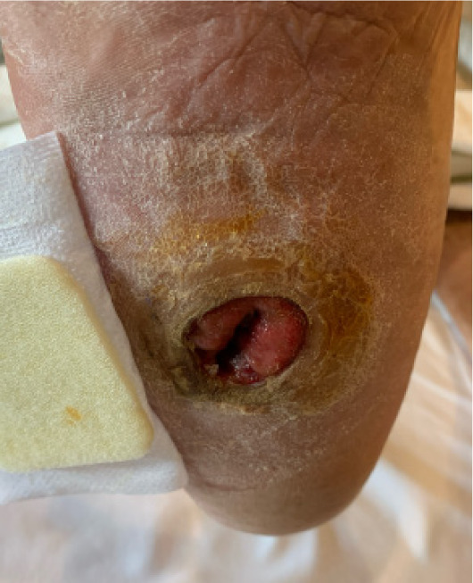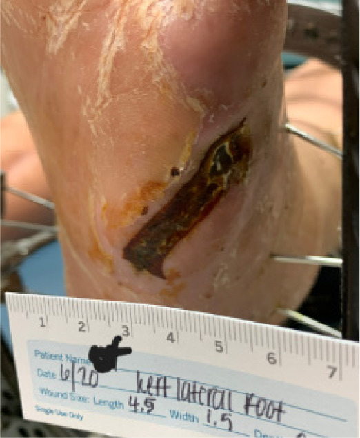 FIGURE 1 Preoperative photograph of chronic ulcer over the lateral left fifth metatarsal