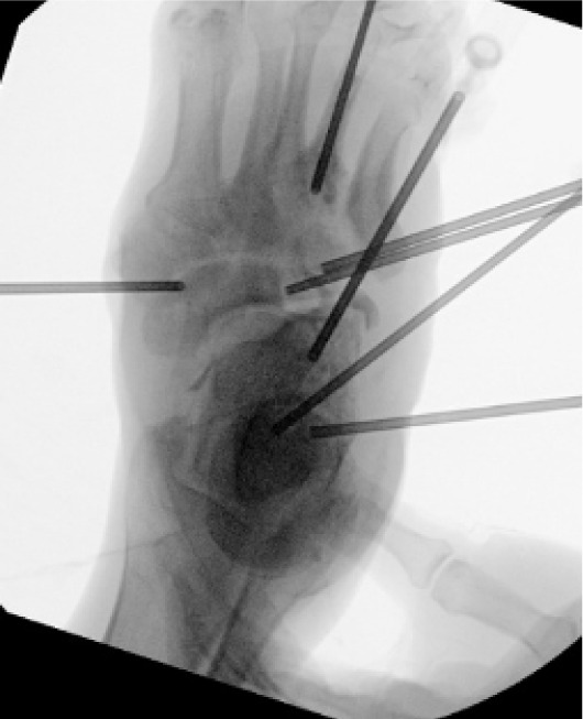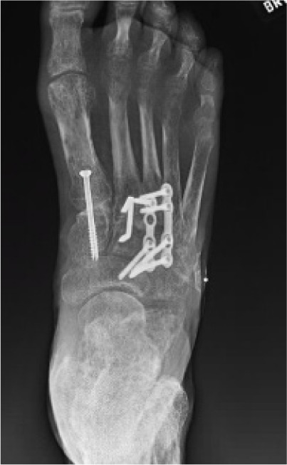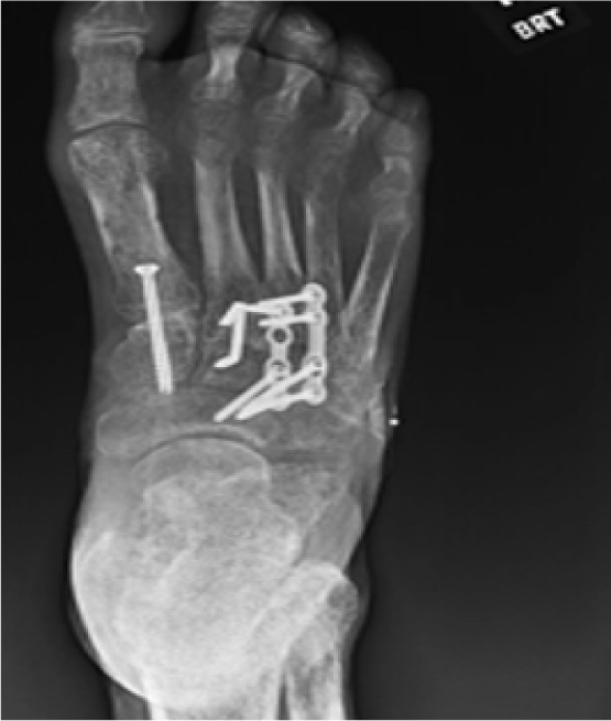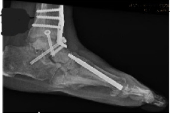 FIGURE 7 Postoperative radiograph after frame removal showing stable fusion and corrected midfoot alignment.