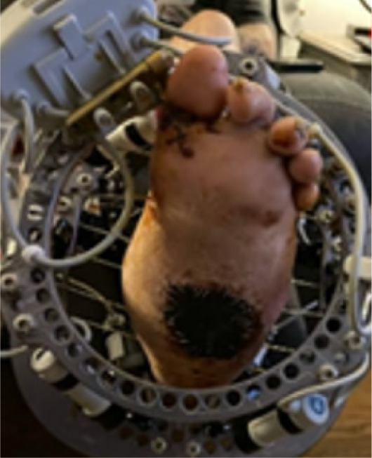 Two days after the initial debridement, the patient underwent corrective surgery to address the underlying structural deformity. Procedures included correction of metatarsus adductus, Lapidus bunionectomy, and application of an external fixator to stabilize the midfoot and offload the lateral column (Figure 2).