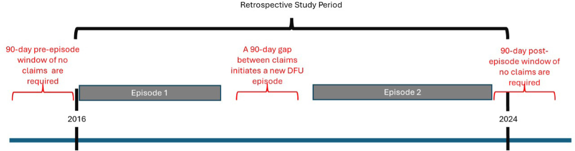 Treatment episodes were defined as continuous wound-related care periods separated by ≥90-day clean period (defined as ≥90 days without wound-related services) (Figure 1). To ensure complete boundary capture, episodes that began within the first 90 days or ended within the final 90 days of the observation window were excluded. Episodes were removed if beneficiaries had end stage renal disease or invalidated if no medical spending occurred during the episode as the absence of reimbursed claims suggested that no billable wound-related treatment or standard care was captured for comparative analysis. Ulcer location (including sacral and heel) was captured and incorporated into matching.