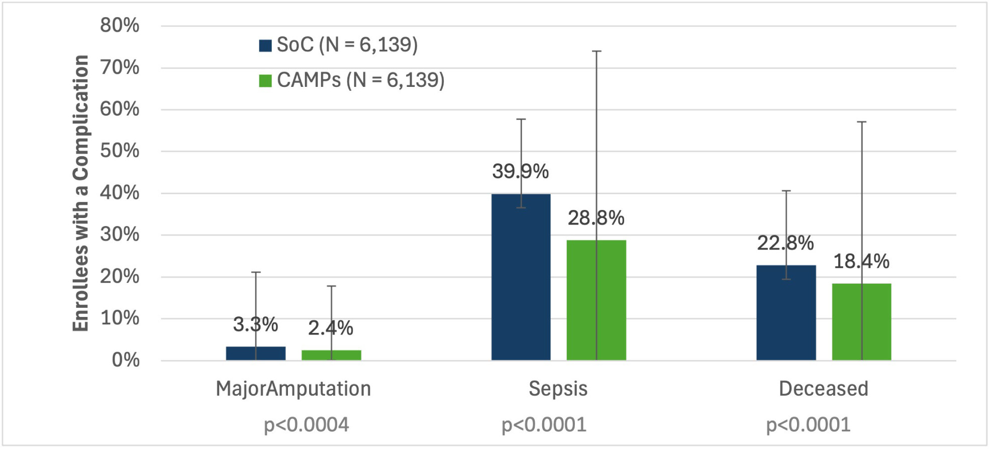 Results: For the 90-day minimum cohort (n=7223 matched episodes per group), CAMP episodes had lower mean PI-associated spending ($36,397 vs $39,886; p=0.0003) and lower mean total all-cause spending ($46,905 vs $50,686; p=0.0006). Compared with SOC, CAMP episodes were associated with lower complications and healthcare resources utilization, including lower sepsis (26.1% vs 36.1%; p<0.0001), lower major amputation (2.2% vs 3.1%; p=0.0004), fewer emergency department (ED) visits (1.34 vs 2.04; p<0.0001) and inpatient visits (1.52 vs 2.24; p<0.0001), and lower mortality (17.8% vs 22.3%; p<0.0001). Episode length was longer with CAMPs (323.8 vs 302.1 days; p<0.0001).