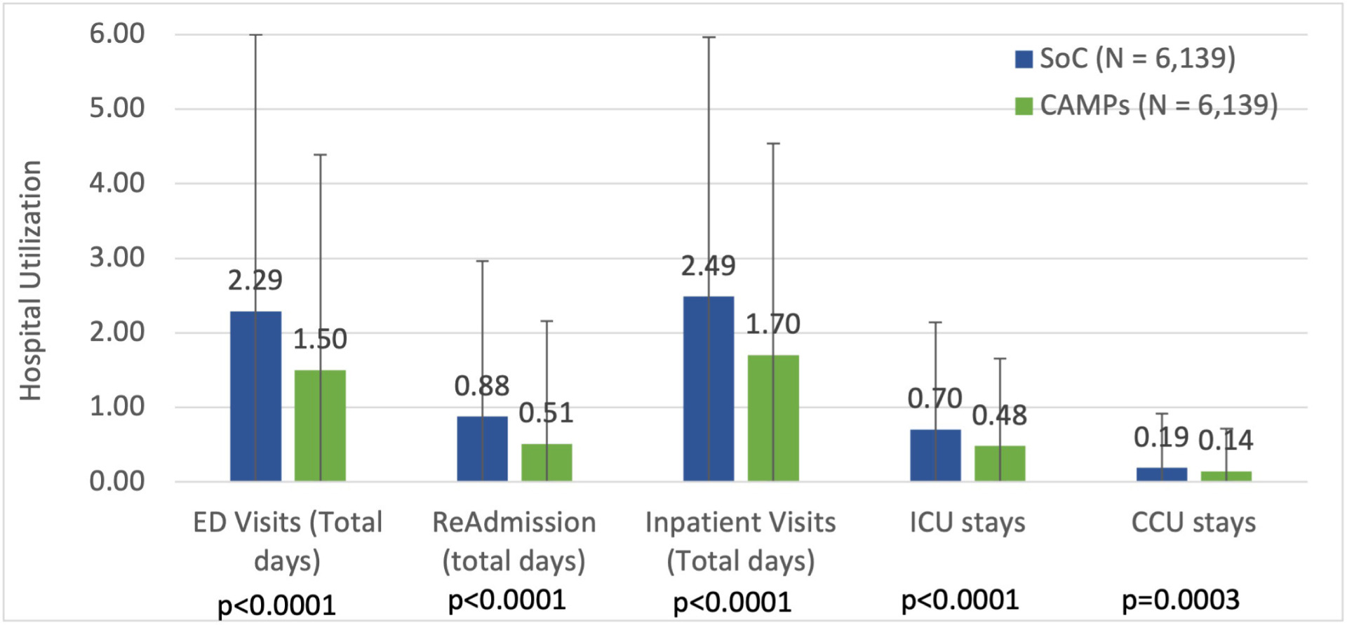 In all cases Medicare enrollees treated with a CAMP had statistically lower complication rates than those who received SOC only. The effectiveness of treatment was evaluated by hospital-based acute-care utilization during the episode, including ED visits, readmissions, inpatient visits, and ICU/CCU. Visits to the ED averaged over 2.2 days per episode for those receiving SOC and 2.4 days of inpatient stays. Additionally, hospital readmissions, ICU, and cardiac care unit (CCU) stays were compared between cohorts and statistically significant reductions were observed with CAMP treatment (Figure 4).