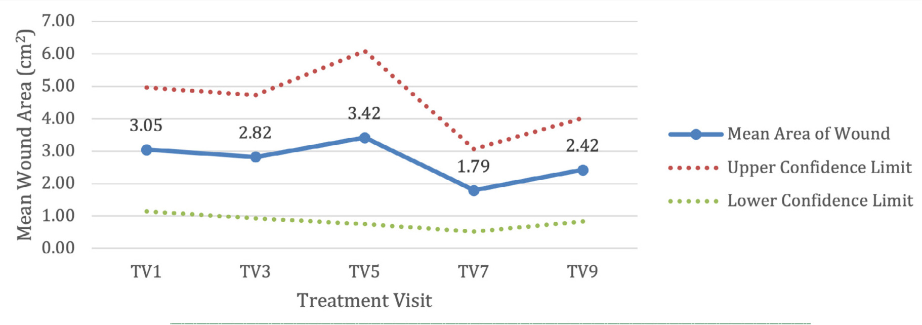 Figure 1 shows a 95% confidence interval of the mean wound area for all patients. Due to the small sample size, the width of the interval is large. Patients saw an overall mean percent area reduction of 21%.