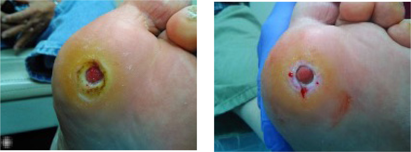 On physical examination, the patient appeared well, with an open plantar ulcer surrounded by abundant periwound callus. There were no clinical signs of infection in the wound bed or adjacent tissues. Despite adherence to standard wound care protocols and receiving several advanced wound care therapies, the ulcer failed to progress toward healing. Given the chronic refractory nature of the wound, the patient was enrolled in the case series and underwent CAP treatment.