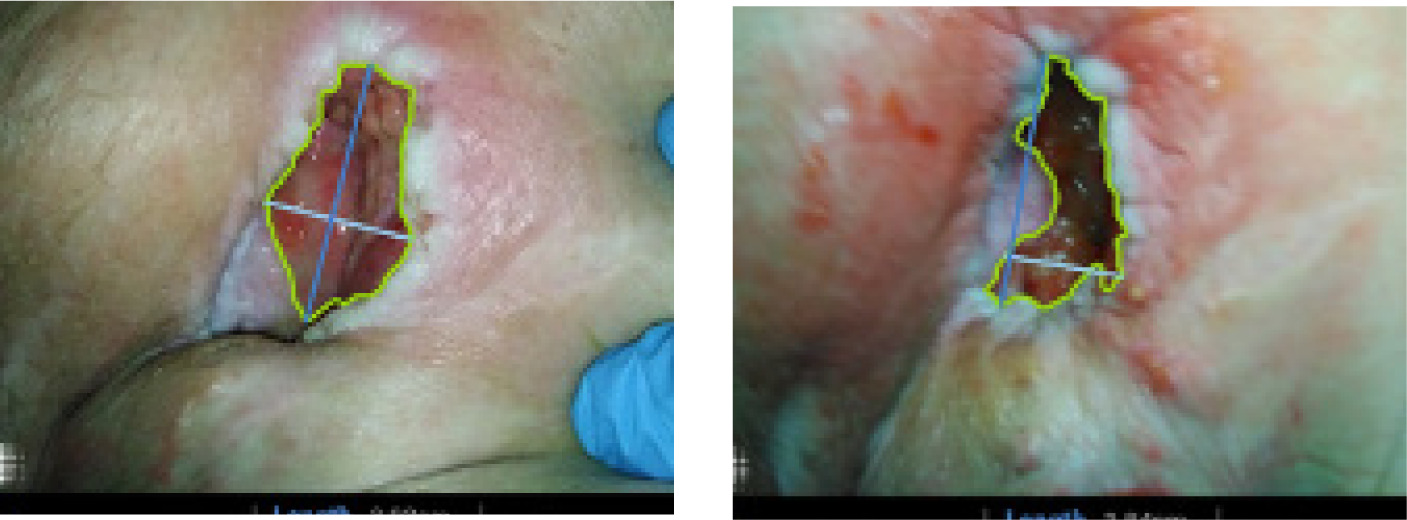 The pressure ulcer case demonstrated mild qualitative improvement despite the absence of measurable area reduction. Over the course of treatment, the wound bed developed healthier granulation tissue, and the surrounding inflammation decreased slightly. Although these changes did not translate into substantial PAR within the 4-week window, they suggest an early biologic response in a highly complex, long-standing pressure injury complicated by multiple comorbidities.