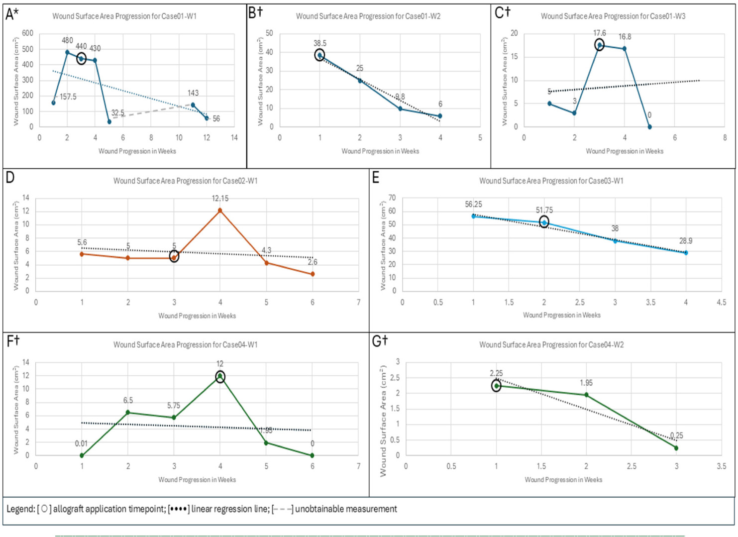 FIGURE 1 *Figure 1A – the dashed line in Figure 1A represents the time points when wound width measurements were unobtainable. †Figure 1B, 1C, 1F and 1G - depict wounds demarked as “healed”, meaning the practitioner has deemed the wounds have healed compared to the initial progression and based on the wound characteristics. Note that in Figure 1A, the uptake seen from 157 to 480cm2 is prior to allograft placement and is not due to any infection to the wound area.