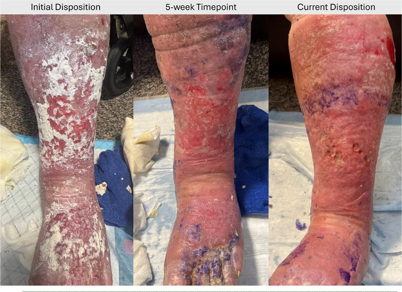 SOC including serial autolytic debridement had been performed for these wounds and failed. Post application of CompleteFT, there were no reports of adverse events or infections for the two bilateral wounds (Figure 3).