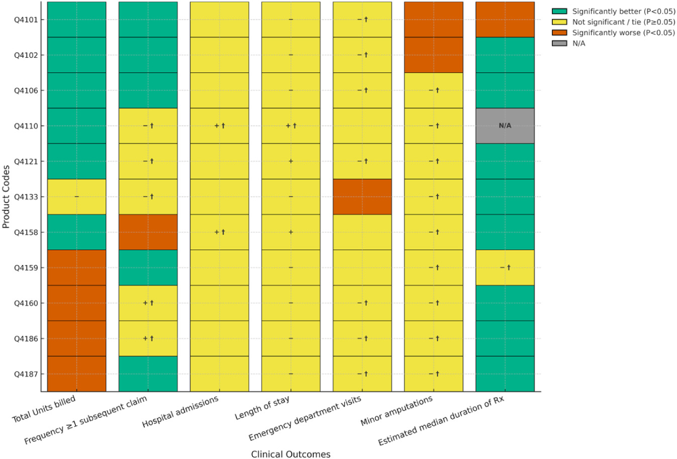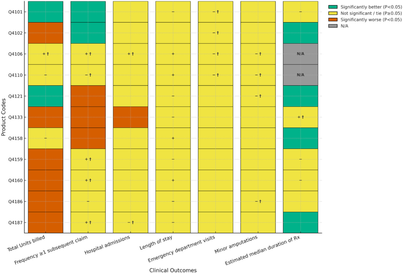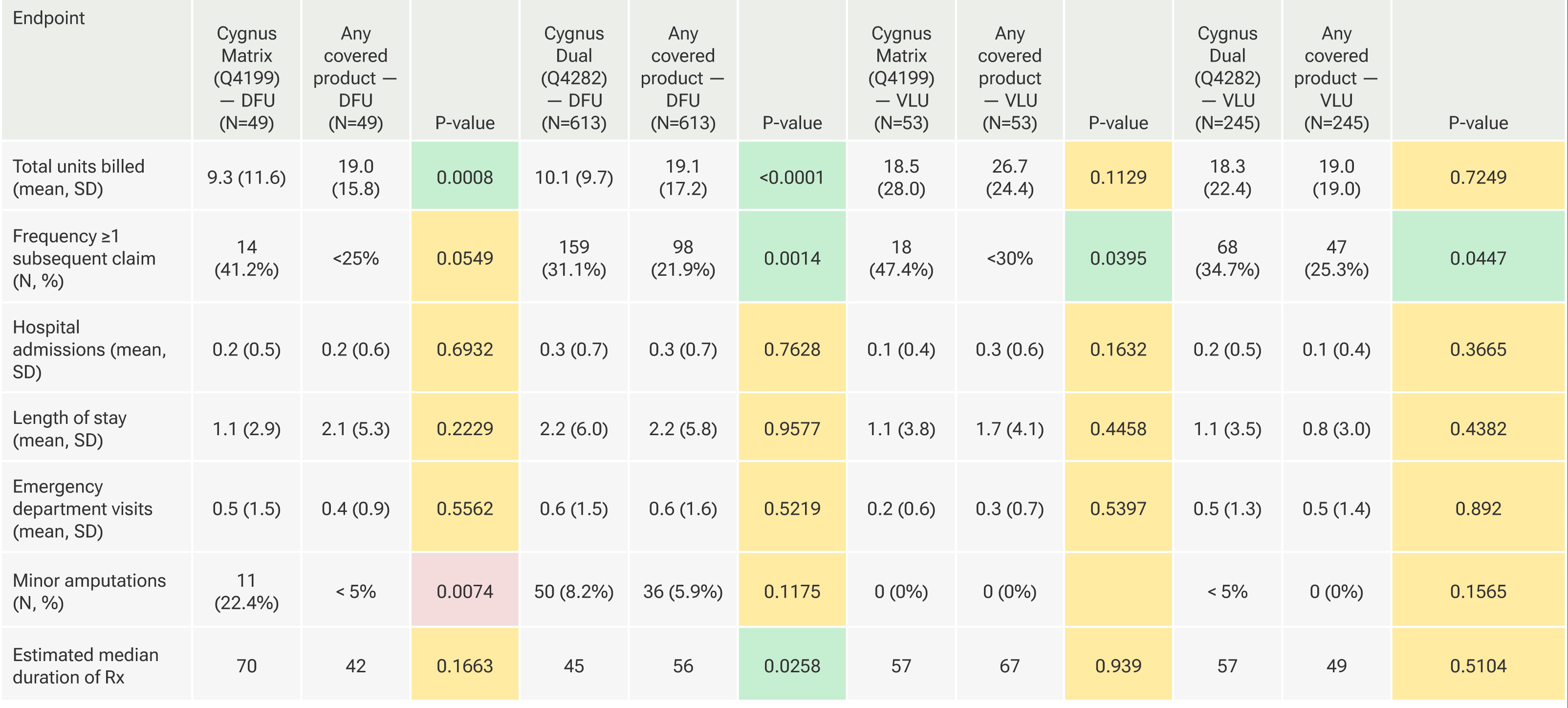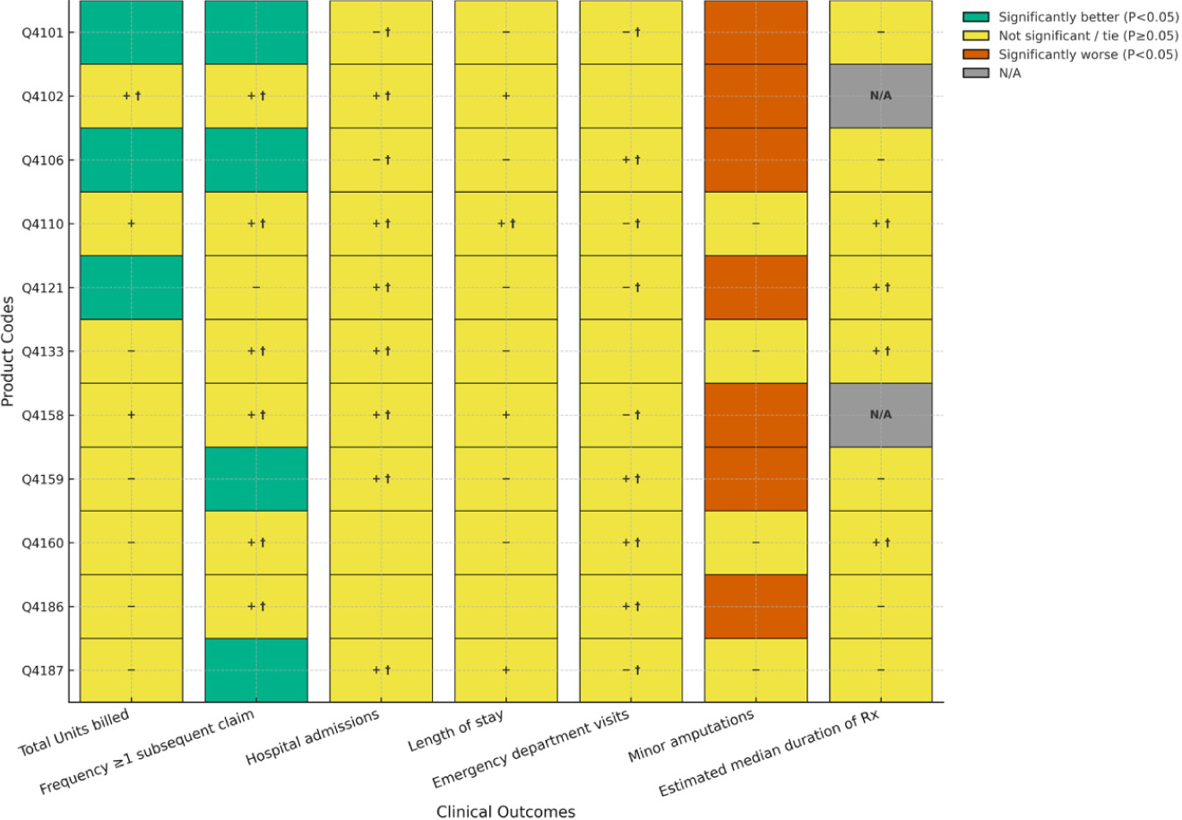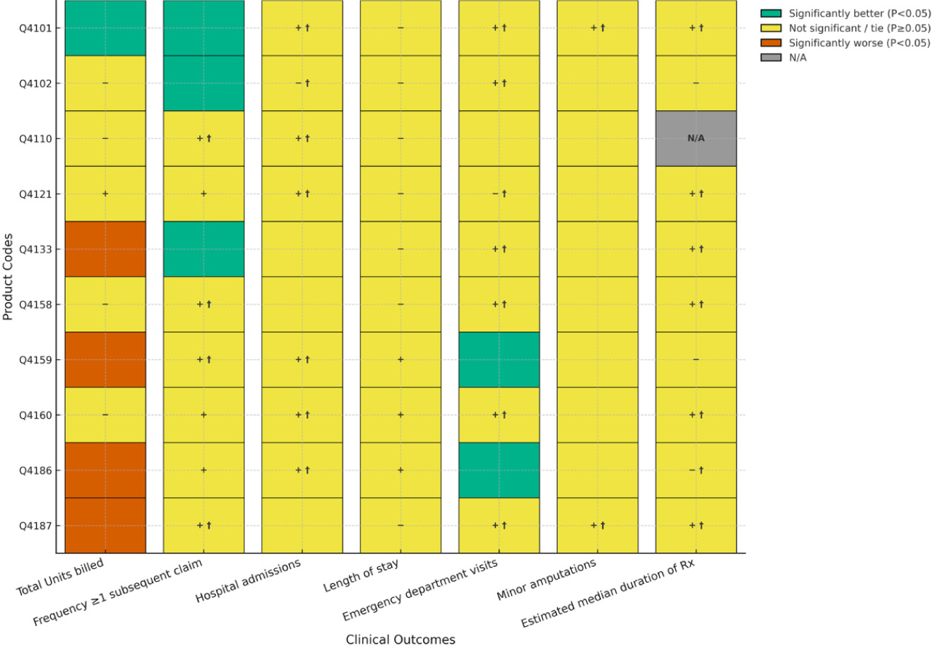 Statistical analyses summarize continuous variables with means/medians/SDs and categorical variables with counts/proportions. Comparative testing employed analysis of variance (ANOVA) with Tukey’s post-hoc for continuous outcomes and chi-square tests for categorical outcomes; therapy duration was analyzed with Kaplan–Meier methods and log-rank tests. Two-sided α=0.05 defined statistical significance for all comparisons. For each Cygnus product for DFUs and VLUs separately, we tabulated clinical outcome frequencies versus each covered product based on 4 criteria: Cygnus significantly (P<0.05) better than comparator (i.e., "superior"), Cygnus better than comparator but not significantly (P≥0.05), Cygnus worse than comparator but not significantly (P≥0.5), and Cygnus significantly (P<0.05) worse than comparator. Due to low frequencies, some non-significant comparisons resulted in “ties” between products. We displayed these comparisons graphically using a heat map schema (green, yellow, red) corresponding to the level and direction of statistical significance.