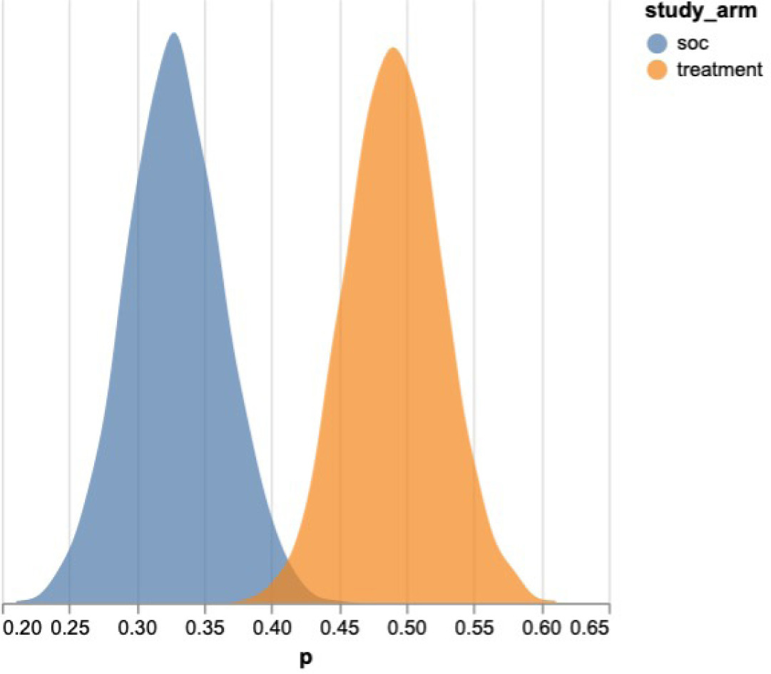 FIGURE 1 Posterior distribution of the average treatment effect of CAMPs vs SOC on the likelihood of complete re-epithelialization..