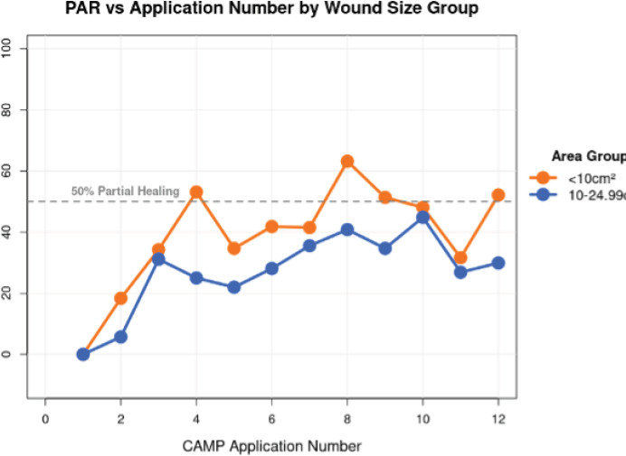 Baseline wound size impacted the percent area reduction with the number of CAMP treatment applications (Figure 1). The PAR effect of more CAMP applications for wound sizes <10cm2 was more pronounced than for wounds between 10 and 25 cm2.