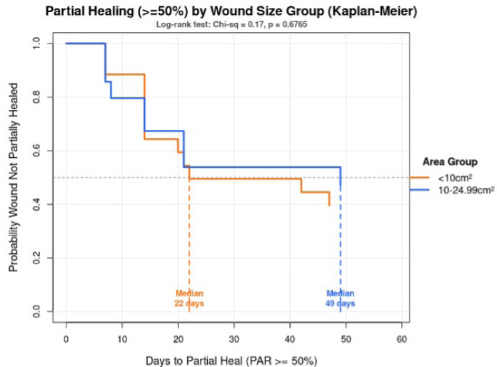Additionally, baseline wound size was shown to affect the likelihood of achieving ≥50% reduction in wound area after treatment (Figure 2). Kaplan-Meier analysis with log-rank test was conducted to show wounds <10 cm2, 53.8% achieved partial healing at 22 days, while 42.9% of wounds sized between 10-24.99 cm2 achieved partial healing in 49 days. Findings showed that smaller wounds trended towards faster healing, but the difference was not statistically significant (p=0.68).