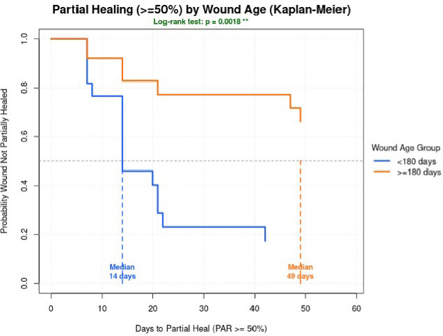 FIGURE 3 Kaplan-Meier analysis with a log-rank test demonstrated a statistically significant difference in time to partial healing between wounds aged <180 days and ≥180 days (log-rank p = 0.0018), with younger wounds achieving partial healing more rapidly.