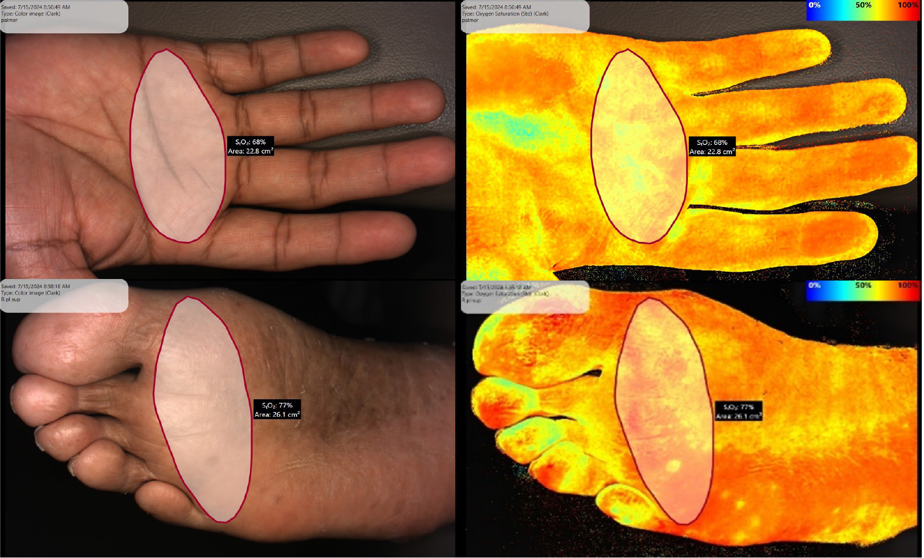 Alternative assessments, such as the toe-brachial index (TBI) and transcutaneous oxygen pressure (TcPO2), present their own limitations in cost, reproducibility, and accessibility.5 Consequently, there remains a significant unmet need for a quick, reliable, simple, and accurate diagnostic alternative. Near-infrared spectroscopy (NIRS) has emerged as a promising, non-contact method to evaluate superficial tissue perfusion by measuring the relative absorption of oxygenated and deoxygenated hemoglobin in real time.6 Devices like SnapshotNIR provide portable high-resolution imaging of tissue oxygen saturation (StO2) across wound beds and extremities.7