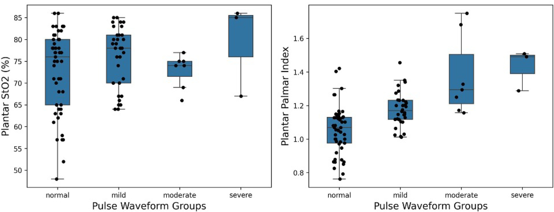 While supine resting plantar StO2 showed no group difference for different PAD groups (Figure 2 - left), the PPI values increased with disease severity (Figure 2 - right).