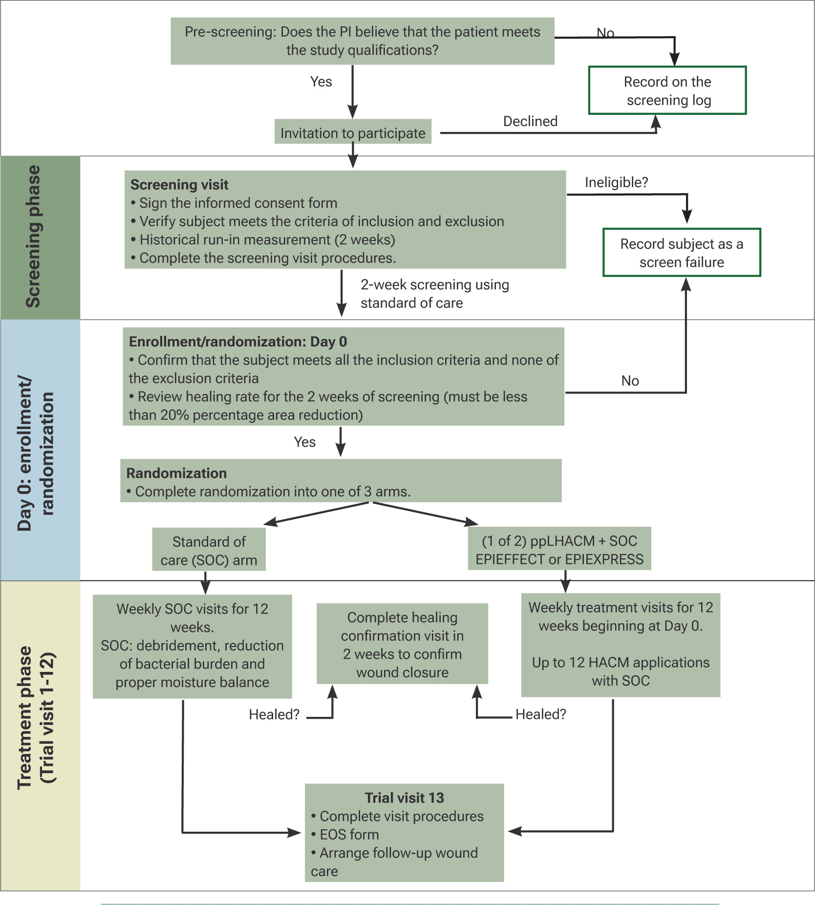 The primary endpoint is the proportion of wounds achieving complete wound closure in 12 weeks. A chi-squared test of independence is planned. The null hypothesis states that the proportion of wounds achieving complete wound closure in 12 weeks is equal for ppLHACMs plus SOC versus SOC alone. The alternative hypothesis states that the proportion of wounds achieving complete wound closure in 12 weeks is not equal for ppLHACMs plus SOC versus SOC alone.