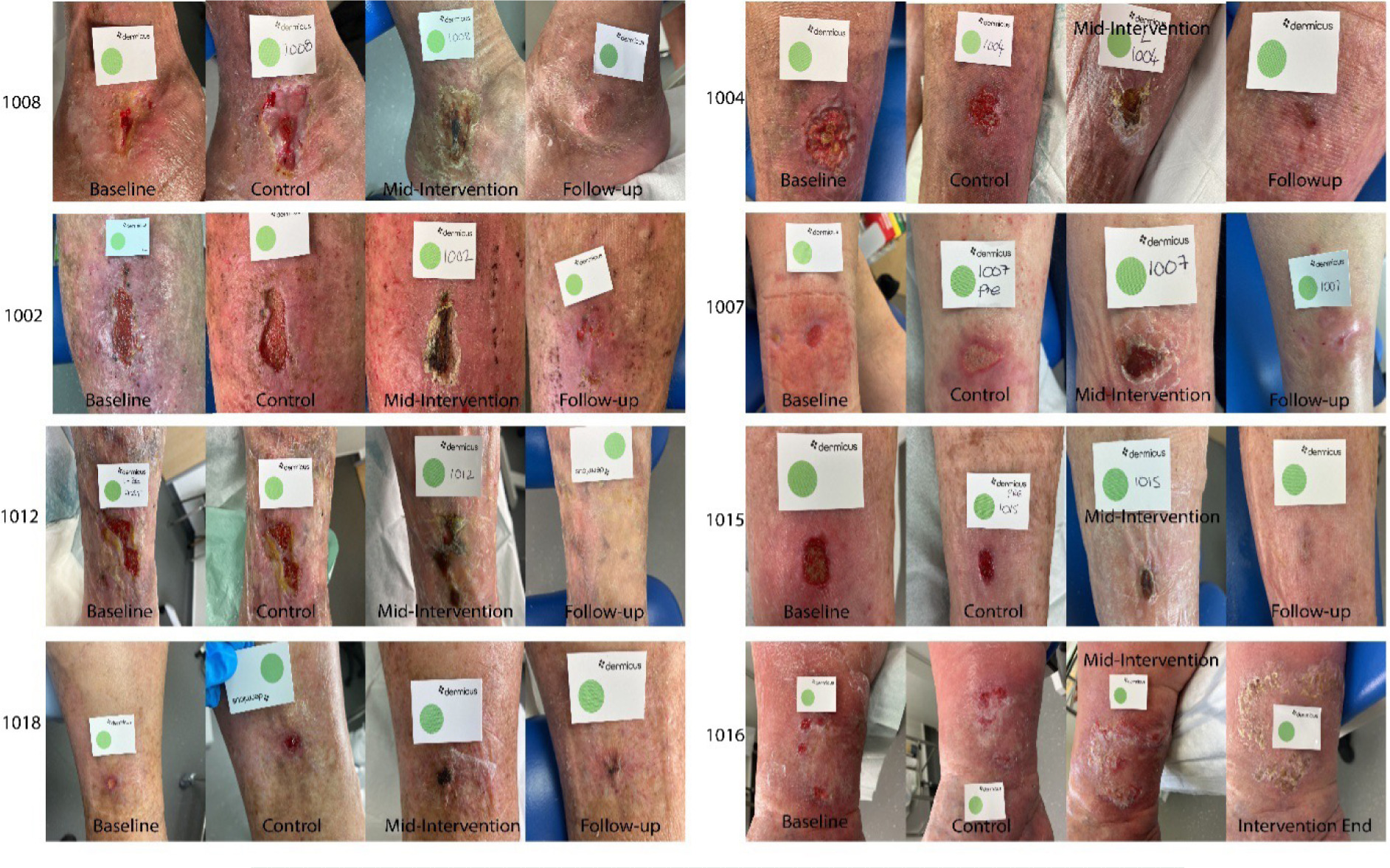 FIGURE 6 Representative examples of wound progression among Epiprotect-treated participants. Sequential wound photographs (Baseline → Control → Mid-intervention → Follow-up) from eight participants (IDs 1002, 1004, 1007, 1008, 1012, 1015, 1016, 1018) demonstrate consistent contraction, granulation, and epithelialisation following transition to Epiprotect. Control-phase images typically show static or inflamed wound beds, while mid- and late-intervention images reveal reduced exudate, cleaner granulating tissue, and re-epithelialised margins. All wounds were chronic venous leg ulcers imaged using Dermicus under standardised lighting and orientation. Progressive healing is visible across all cases, with substantial improvement by the 12-week follow-up.