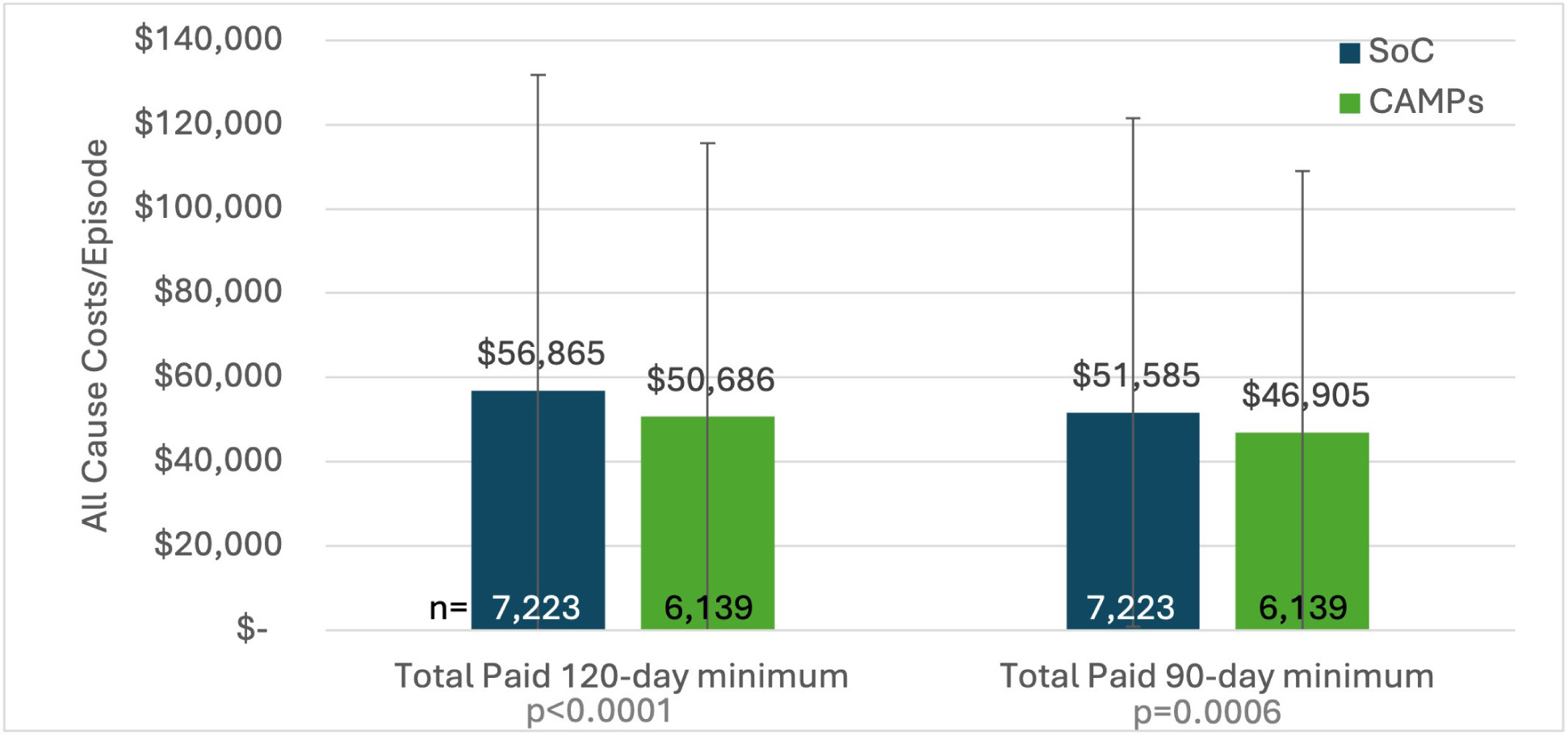 Results: For the 90-day minimum cohort (n=7223 matched episodes per group), CAMP episodes had lower mean PI-associated spending ($36,397 vs $39,886; p=0.0003) and lower mean total all-cause spending ($46,905 vs $50,686; p=0.0006). Compared with SOC, CAMP episodes were associated with lower complications and healthcare resources utilization, including lower sepsis (26.1% vs 36.1%; p<0.0001), lower major amputation (2.2% vs 3.1%; p=0.0004), fewer emergency department (ED) visits (1.34 vs 2.04; p<0.0001) and inpatient visits (1.52 vs 2.24; p<0.0001), and lower mortality (17.8% vs 22.3%; p<0.0001). Episode length was longer with CAMPs (323.8 vs 302.1 days; p<0.0001).